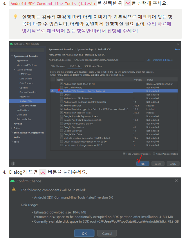 Android Command-line Tools는 Flutter에서 Android에 명령을 내리기 위해 필요합니다.