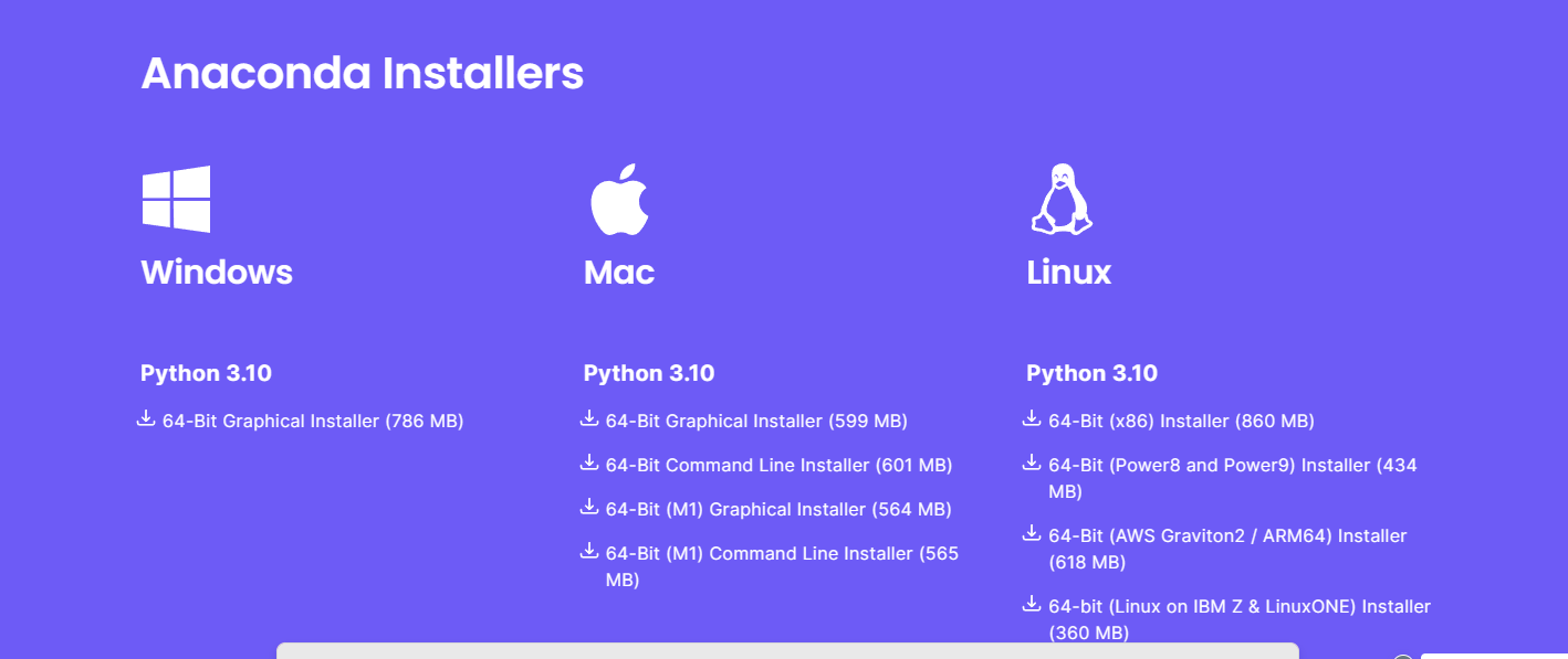 1-1 . 아나콘다 공식 사이트에 접속하셔서 맽밑에 스크롤을해보면 자기에 맞는 OS 사양에 맞게 다운로드해줍니다.