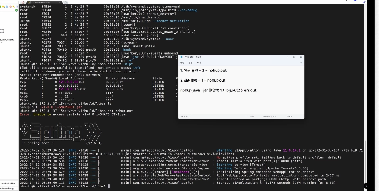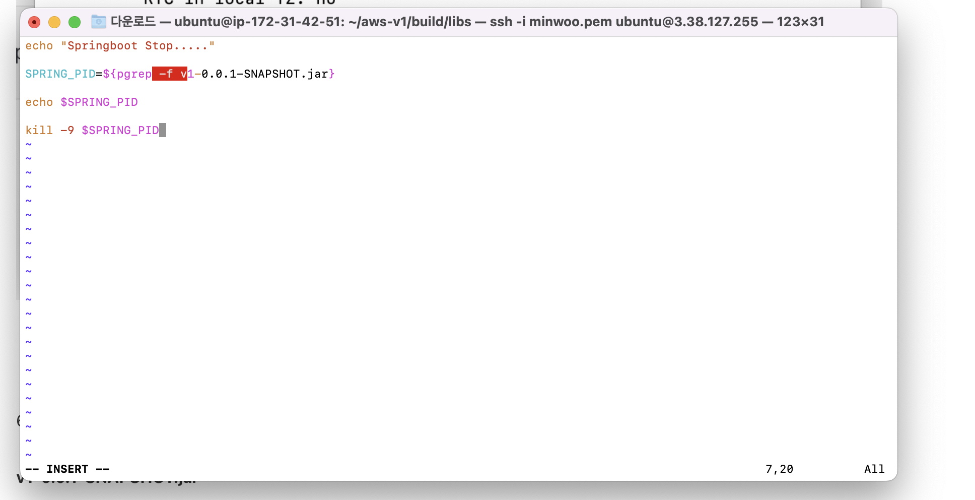 SPRING_PID=$(pgrep -f v1-0.0.1-SNAPSHOT.jar) ( pid 찾기 )