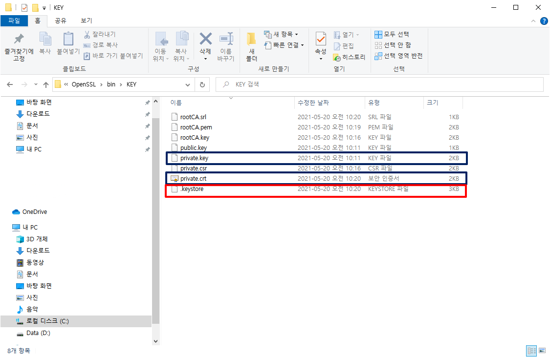 만약 키를 만들게 된다면, 이렇게 제공하게 되는데, 우리가 살펴봐야 할 것은 확장명이 crt와 key입니다.