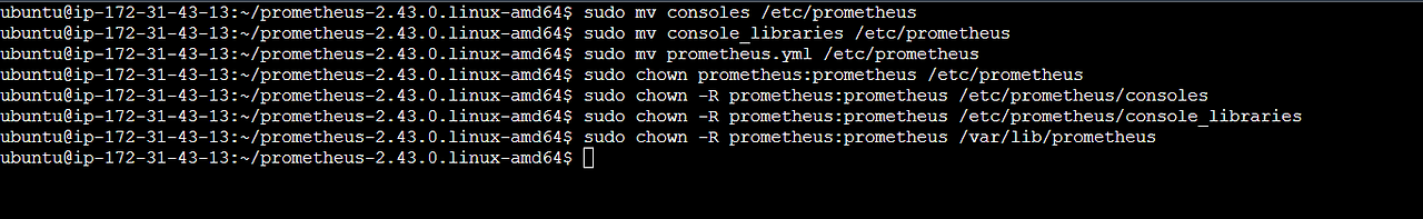 다음으로, 구성 파일을 이동하고 소유권을 설정하여 Prometheus가 액세스할 수 있도록 합니다. 이를 위해 다음 명령을 실행합니다.