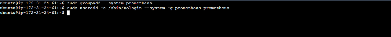 이제 Prometheus에 대한 그룹과 시스템 사용자를 만듭니다. 그룹을 만든 다음 그룹에 사용자를 추가하려면 다음 명령을 실행합니다.