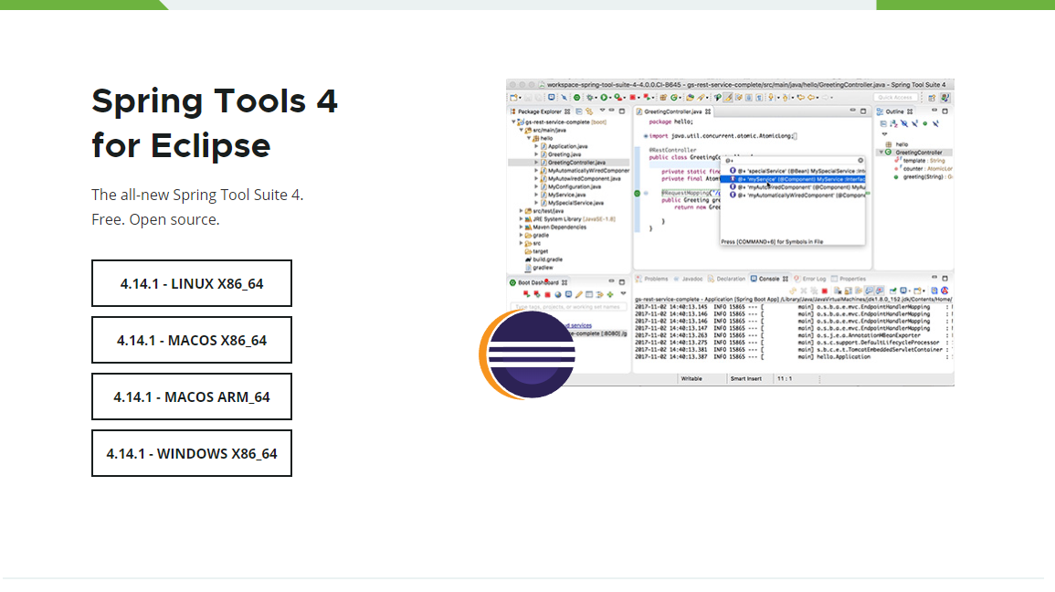 Largely rebuilt from scratch, Spring Tools 4 provides world-class support for developing Spring-based enterprise applications, whether you prefer Eclipse, Visual Studio Code, or Theia IDE.