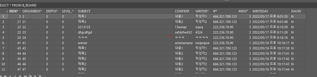 INSERT INTO B_BOARD(bidx,originbidx,depth,level_,subject,content,writer,ip,midx)values(bidx_b_seq.NEXTVAL,bidx_b_seq.NEXTVAL,0,0,작성,내용2,김또강t,3,3);