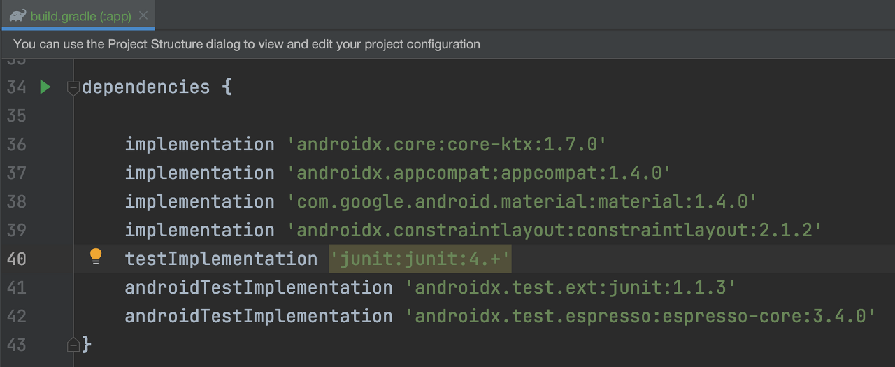 - dependencies 블럭에 'junit:junit:4.+' 로 버전이 명시되지 않은 부분 수정