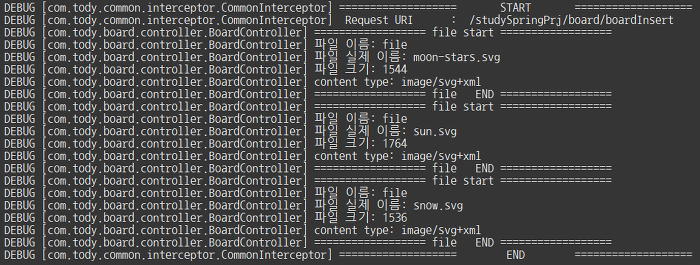 실행을 해서 파일을 여러개 추가해서 글을 작성해보자. 그러면 로그에도 이렇게 업로드한 파일의 실제 이름, 크기, 타입 등을 확인할 수 있다. 다중 파일 업로드가 아닌 단일 파일 업로드를 하려고 한다면, 배열로 선언된 MultipartFile[] 부분을 MultipartFile 로 선언해주면 된다. 이제 배열로 파일들이 들어온 걸 확인 했으니 컨트롤러를 원상복귀시킨 뒤에 업로드를 처리하는 클래스를 만들어보자.