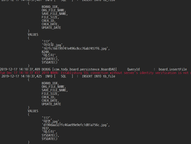파일을 제외하고 게시글의 내용만 등록하는 쿼리를 볼 수 있다.