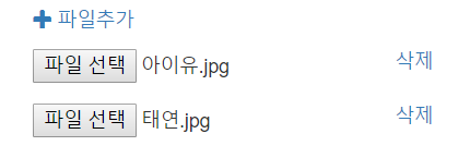 파일추가 버튼을 누르면 파일 선택 폼이 하나씩 생기고 삭제를 누르면 해당 폼이 없어지는 형태로 구성하였다.