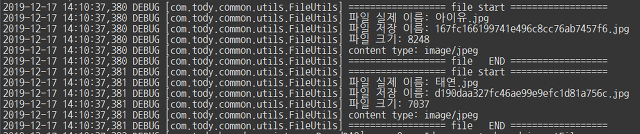 fileUtils 클래스에서 파일의 정보들을 확인할 수 있다. 그리고 파일들이 하나씩 등록되는 것도 볼 수 있다. 파일이 업로드될 디렉토리로 가보면(context-file.xml에 설정함) 업로드한 파일들이 랜덤의 이름으로 저장되어 있는 것을 확인할 수 있다.