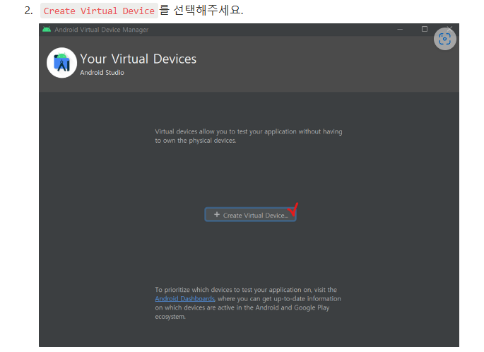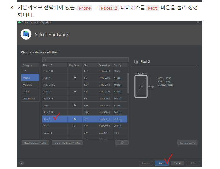 💡 앱을 개발시 실제 휴대폰을 연결하여 개발을 진행할 때도 있지만, 대부분의 경우 AVD(Android Virtual Device, 컴퓨터에 가상의 휴대폰을 띄우는 소프트웨어)를 이용하여 개발합니다.