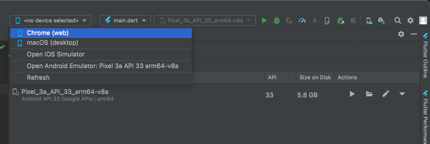 앱 실행을 위해 오른쪽 상단에 원하는 디바이스 Simulator를 선택해도 되고, 간단하게 Chrome(Web) 으로 띄워보겠다.