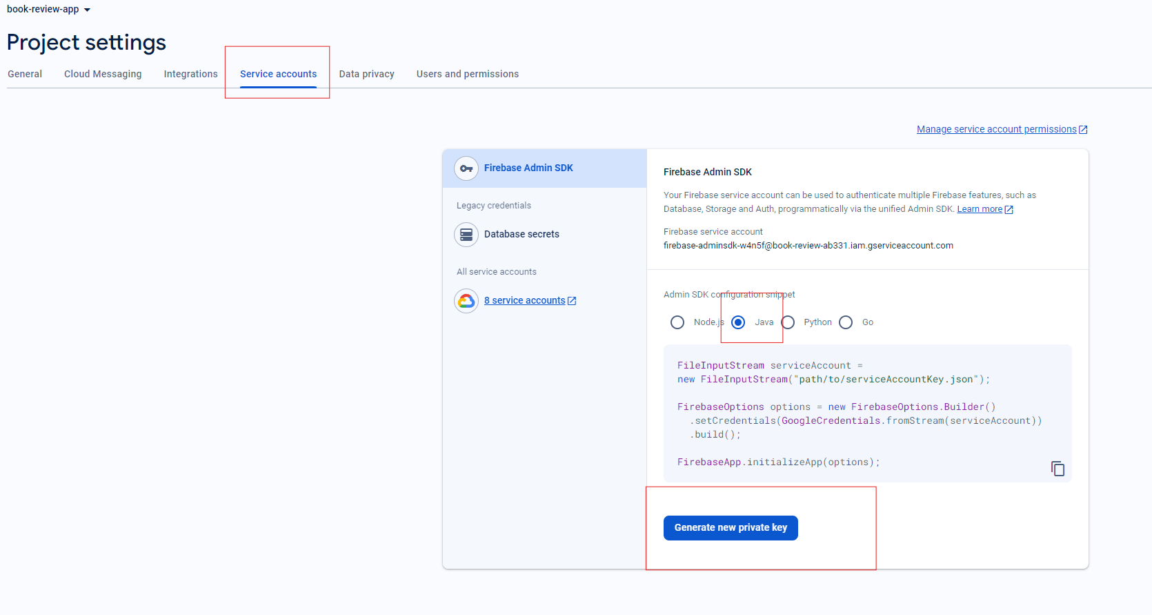 1. 프로젝트 설정 > 서비스 > JAVA > 키 생성 클릭